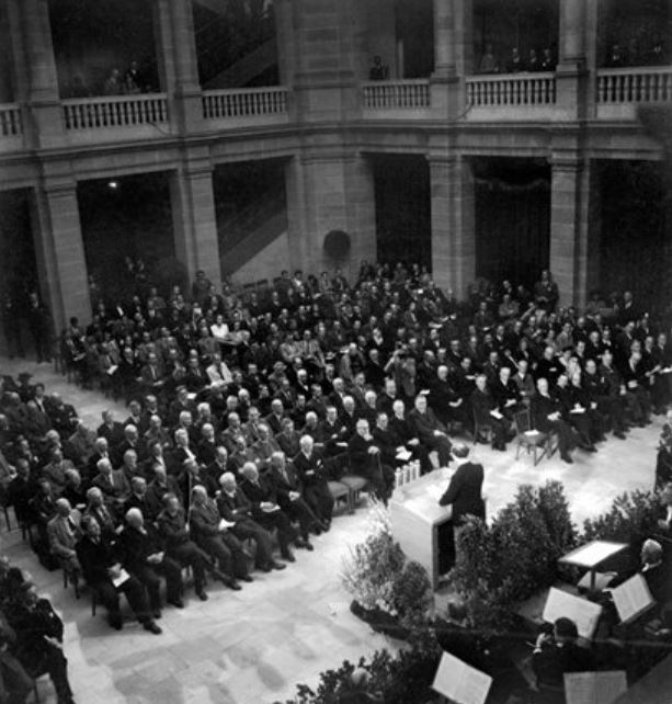 Bonn 1949: Der Ministerpräsident von NRW, Karl Arnold, hält die Eröffnungsrede. Arnold betont in seiner Rede den vorläufigen Charakter des zu schaffenden Grundgesetzes. Für den Festakt wurde der Lichthof des Museums umgestaltet.