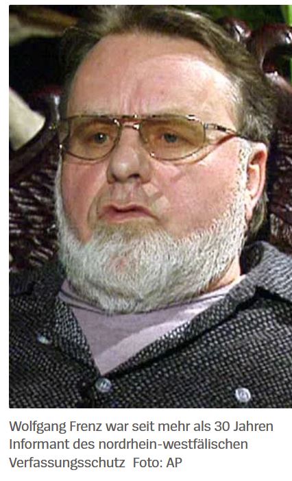 Wikipedia: Wolfgang Frenz (* 13. September 1936 in Wuppertal) ist ein deutscher rechtsextremer Po-litikfunktionär und Gründungs-mitglied der NPD. Er arbeitete 36 Jahre als V-Person für den Ver-fassungsschutz und erhielt in dieser Zeit nach eigener Aussage 1,6 Millionen Mark.