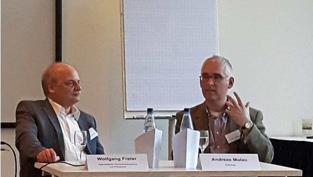Andreas Molau 2016 bei einem Gespräch mit Wolfgang Freter (Referatsleiter Rechtsextremismus und Prävention, Verfassungsschutz Niedersachsen) referieren in einem Workshop des Symposiums über das Thema: Ausstieg aus der rechtsextremen Szene – Reintegration in die Gesellschaft!