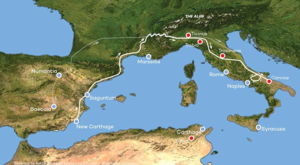 Der Weg ging vom spanischen Teil Karthagos an der Küste entlang nach Nordwesten auf Rom zu. Die Überraschung gelang. Rom war ahnungslos, und der Entsetzensruf