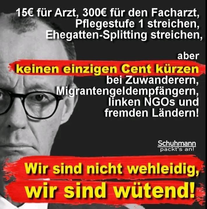 Natürlich wird das deutsche Volk nicht gefragt, egal um welchen politischen Wahnsinn es sich auch immer handelt. Wir dürfen für den Wahnsinn aber haften und bezahlen ! Ich habe es schon 100 Mal geschrieben. Mitbestimmung und Demokratie sind in Deutschland eine Farce, ein Witz ! Es ist nur die Illusion einer Demokratie, ein System der Fremdherrschaft und eine globalistische Ausbeutung unseres Landes die jenseits aller Beschreibung ist. Alle maßgeblichen Entscheidungen werden hinter verschlossenen Türen in aller Heimlichkeit getroffen und zwar nicht von uns, dem deutschen Volk, sondern von Lobbyisten, Globalisten, gekauften u. erpressten Eliten, NGOs und sonstigen fragwürdigen Institutionen. Für uns, das deutsche Volk, wurde ein verblödetes Parteiensystem geschaffen, das uns ständig mit Schwachsinn beschäftigt halten soll und das wir praktisch nicht abwählen können. Alle deutschen Politiker sind nur lächerliche Marionetten in einem nie endenden Kasperle-Theater. Sie dienen, wie alle anderen vor ihnen, nur den Vorgaben und Interessen der Banken- und Geldmacht sowie dem militärisch-industriellen Komplex. Kein Wunder, daß BlackRock-Merz nach Krieg schreit, wo doch BlackRock der größte Anteilseigner bei Rheinmetall ist.