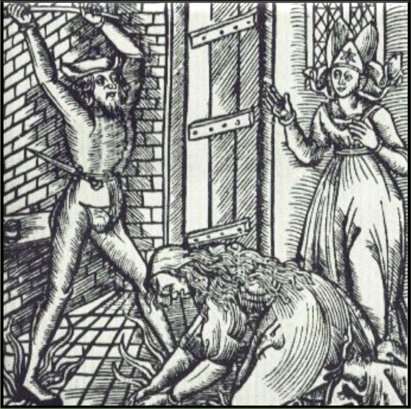 Ein getreuer Bruder des christlich-katholischen Weltherrschers in Rom: Konrad von Marburg, der „Bluthund“, der seine Zeit für unsere Vormütter zur Hölle machte. Die „Moral“ seines Glaubens und Umerziehen-Müssens kam aus seiner für fremdes Leid restlos abgetöteten Seele, die ihn zu jeder Grausamkeit befähigte.