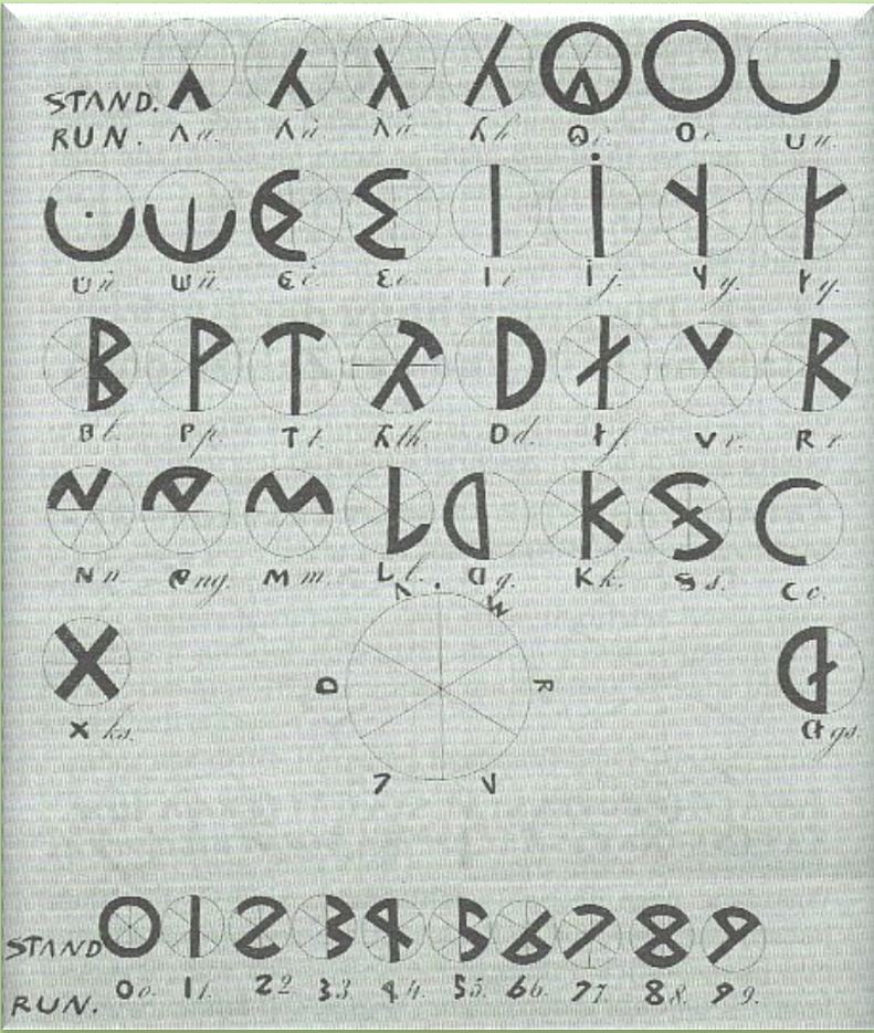 Buchstaben und Zahlen aus der Hagal-Rune entwickelt (Quelle: Harm Menkens, Die Oera-Linda-Handschriften – Die Frühgeschichte Europas)