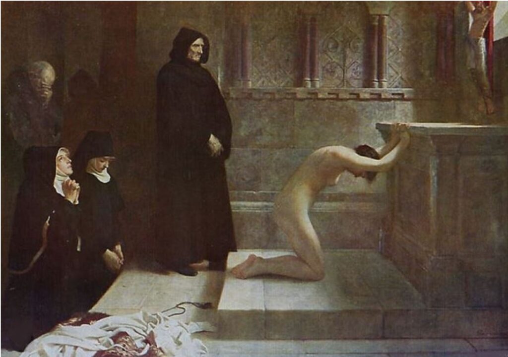 Konrad von Marburg, der vom Papst bestellte Beichtvater der Elisabeth von Thüringen, beim Züchtigen der jungen Frau, der er die Freundinnen, die Kinder und ihr Vermögen abnehmen ließ, so daß sie entkräftet und lebensmüde bereits im 24. Lebensjahr ver-starb.